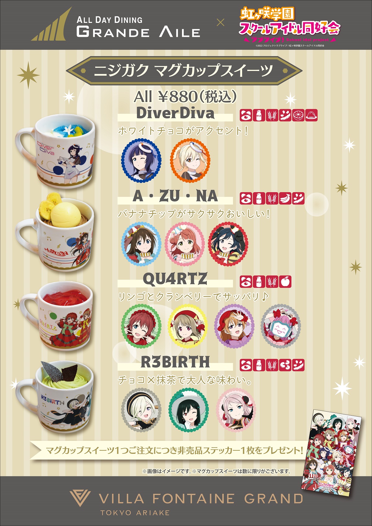 今回はコラボルームに合わせてユニットメニューをご用意。マグカップのデザインもユニットデザインに一新。マグカップスイーツをご注文の方はご注文されたユニットマグカップをお持ち帰りいただけます。さらに今回からはマグカップをご注文のお客様に「オリジナルステッカー」をプレゼントいたします!