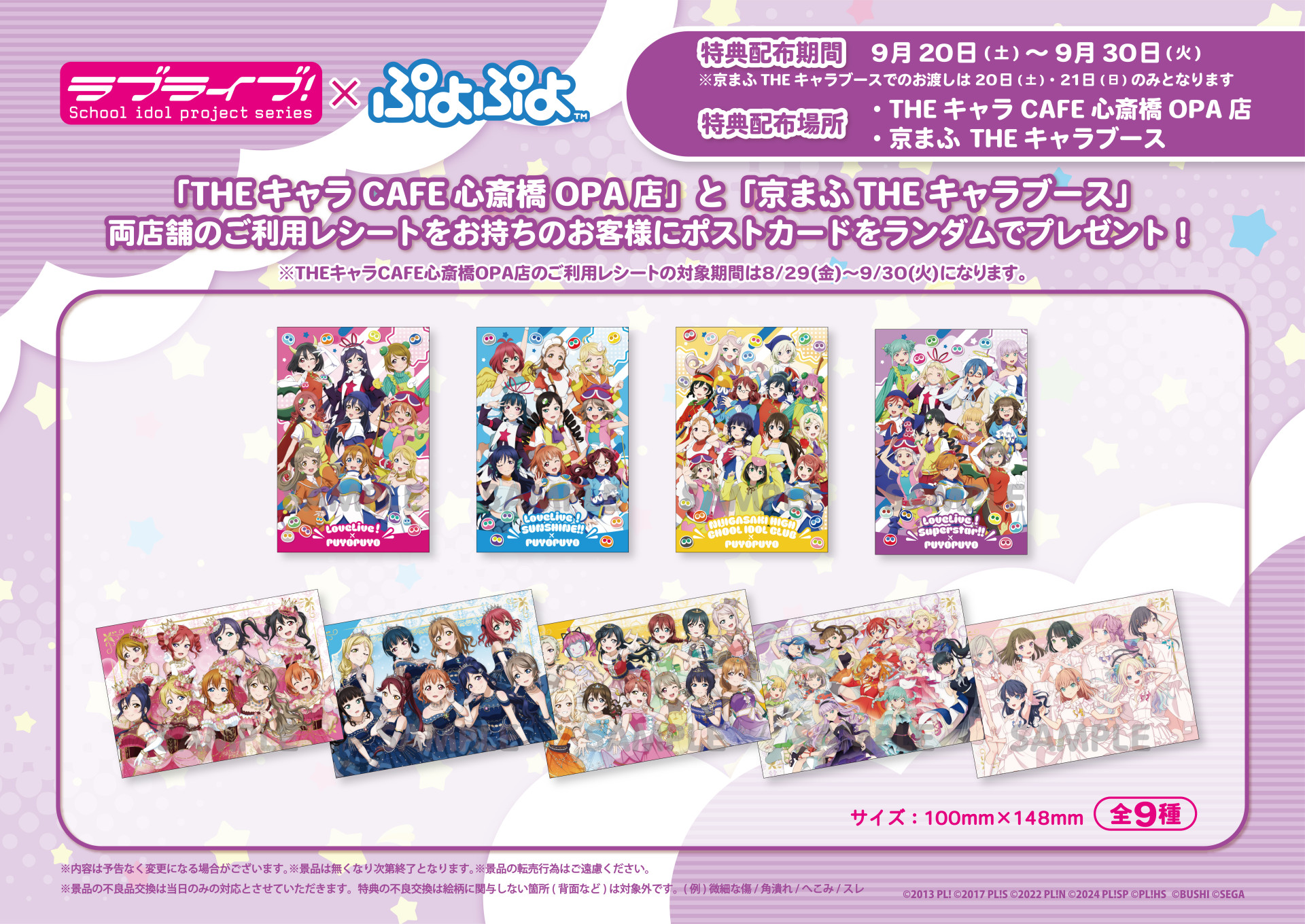 また、8/29(金)より開催の『THEキャラCAFÉ心斎橋OPA店×ラブライブ!シリーズ』との連動施策が決定!「THEキャラCAFÉ心斎橋OPA店」と「京まふTHEキャラブース」両店舗のご利用レシートをお持ちのお客様にポストカード(全9種ランダム)をプレゼントいたします♪